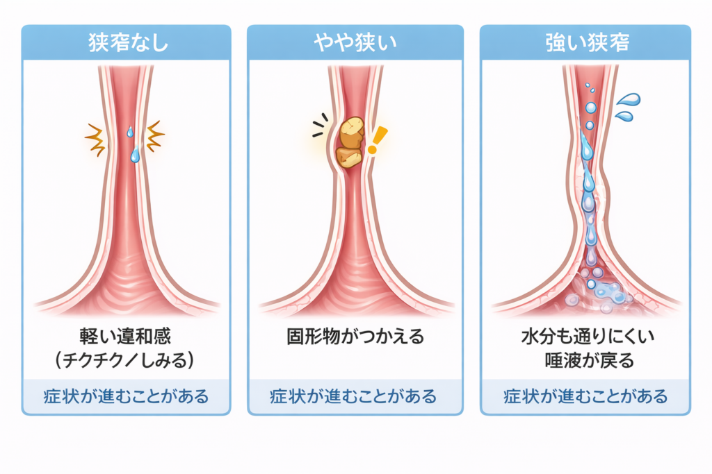 飲食時の胸の違和感が繰り返す、つかえ感が増える、食事量が落ちて体重が減る、といった“進む変化”は、食道が狭くなっている可能性を含むためです。