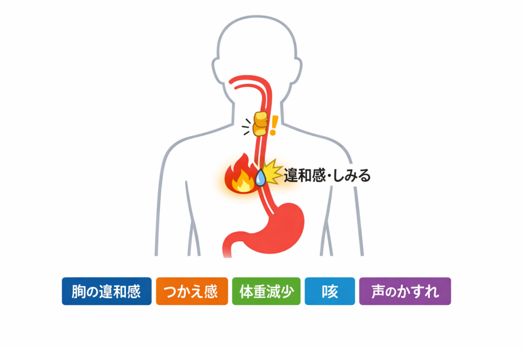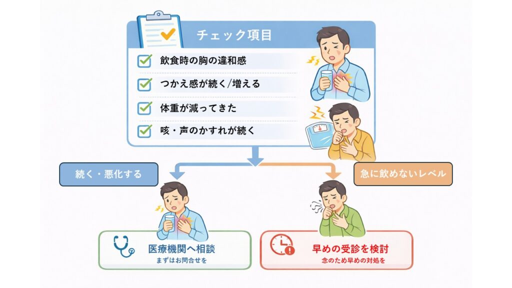 一方で、早い段階でも“それらしい違和感”が出ることはあり、特に飲食時の胸の違和感は「早期発見のために注意しておきたい症状(危険サイン)」として公的情報でも挙げられています。