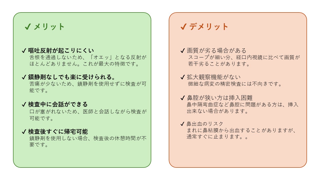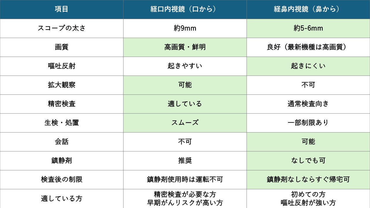 経口内視鏡の方が画質が良く、拡大観察も可能なため、微細な病変の発見に優れています。ただし、経鼻内視鏡でも通常の病変は十分に発見可能です。精密検査が必要な場合は経口内視鏡をお勧めします。