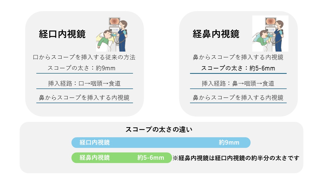 経口内視鏡と、経鼻内視鏡の基本的な違いです。
