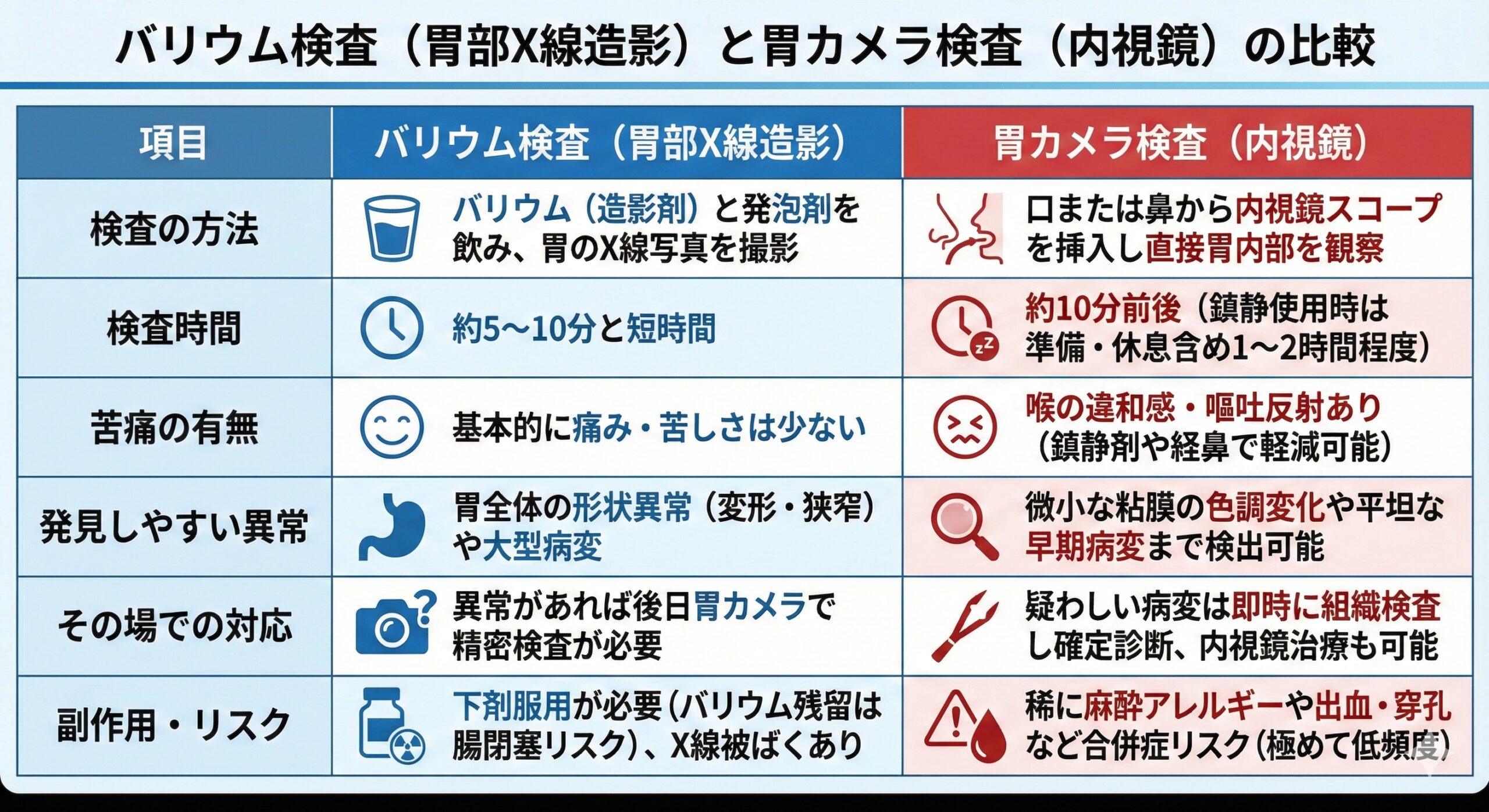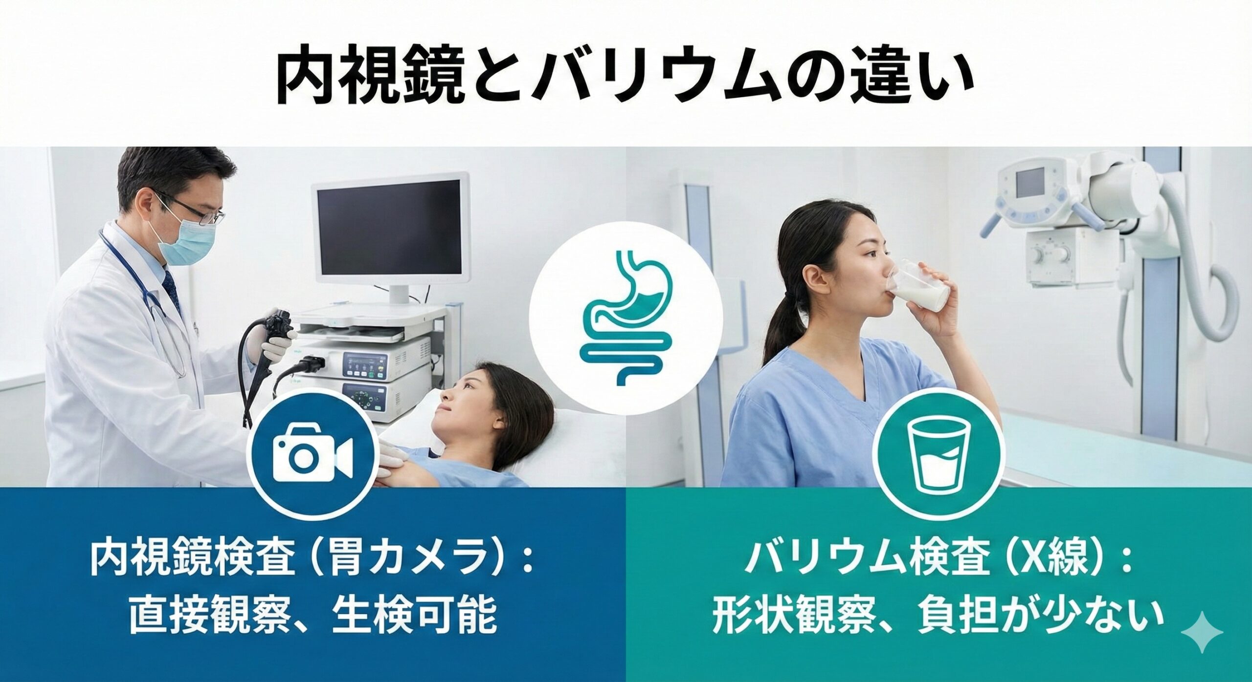 バリウム検査か胃カメラか迷っていませんか? これは毎年の健康診断シーズンに多くの方が抱える悩みです。特に胃の検査を希望される方にとって、胃の検査方法の選択は重要な問題でしょう。この記事では、従来から行われているバリウム検査(胃部X線検査)と胃カメラ検査(胃内視鏡検査)の特徴やメリット・デメリットをわかりやすく比較し、どちらを選ぶべきかについて解説します。最終的には早期発見に有用な胃カメラ検査をおすすめし、その理由と当院での取り組みをご紹介します。
