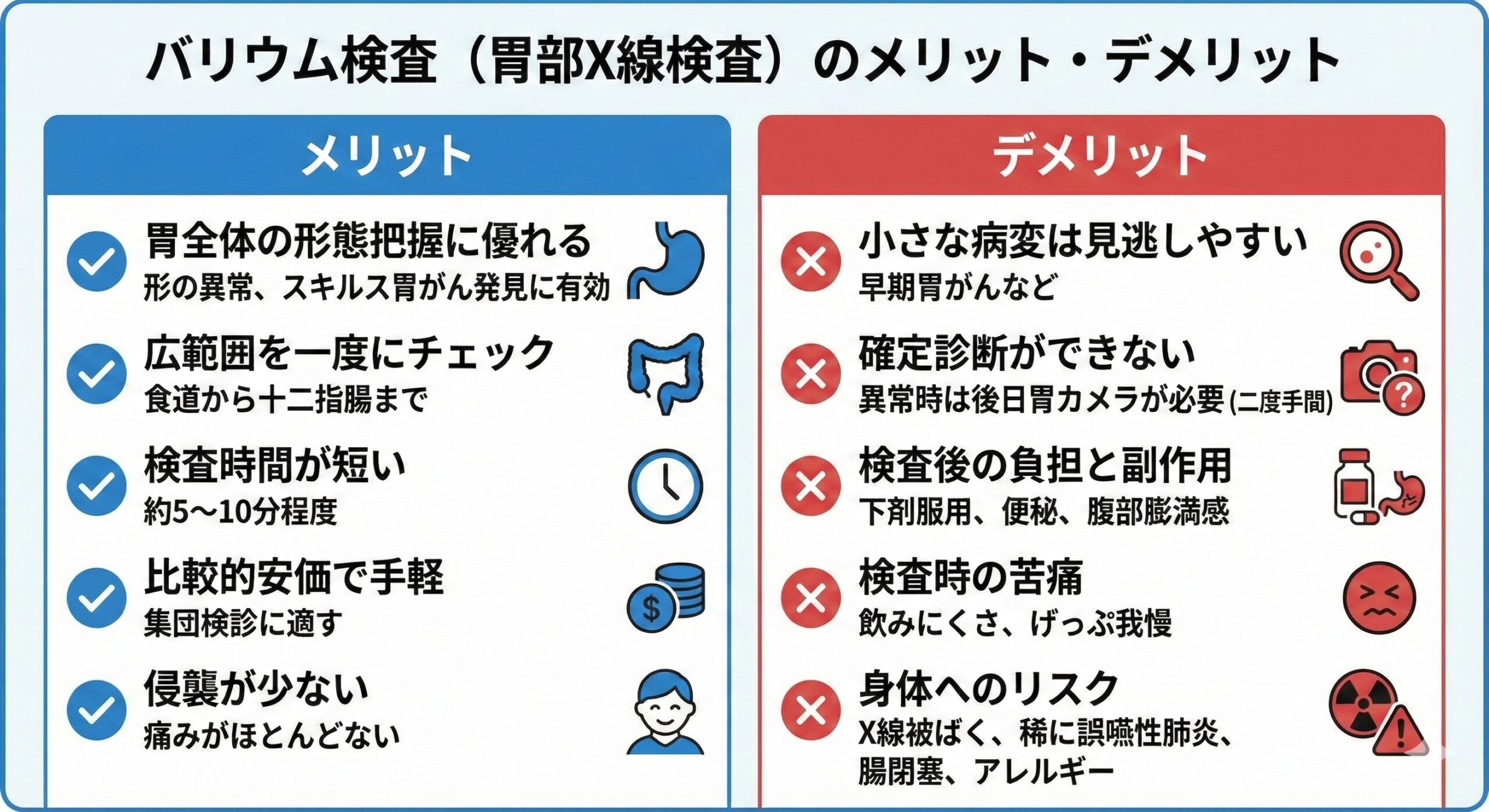 実際にこれまで集団検診では、レントゲン技師でも施行でき効率の良いバリウム検査が広く用いられてきました。加えて侵襲が少なく、体の外から撮影するだけなので体内を器具で触れない安心感があります。飲んだバリウムは検査後に排出しますが、基本的に検査自体の痛みはなく、気軽に「まずは一通り胃のチェック」をしたい人に適した方法と言えるでしょう。
