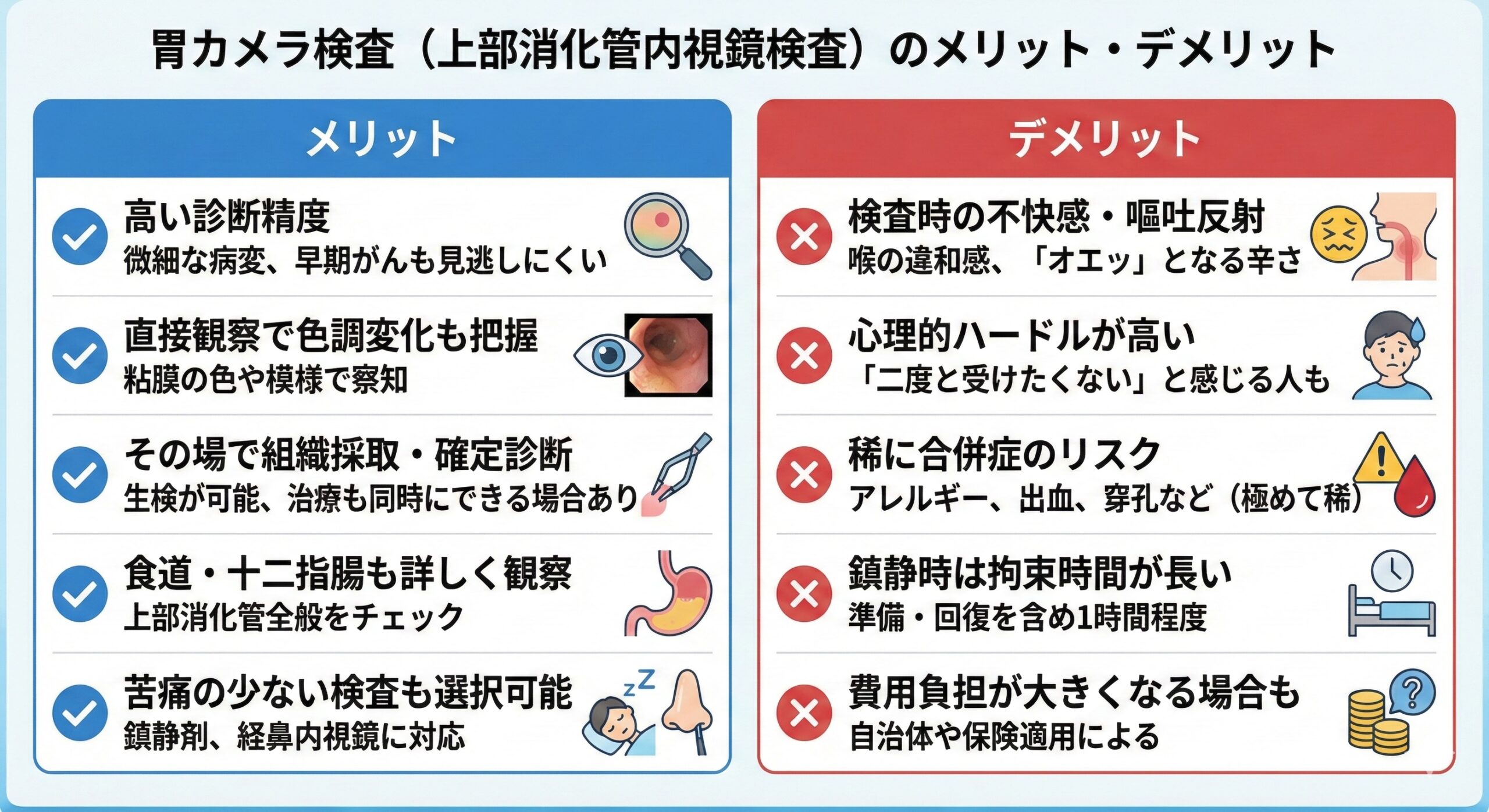 一方、「胃カメラは苦しいから嫌だ」「以前つらい思いをした」という声があるのも事実です。しかし前述の通り、現在では鎮静剤の併用や経鼻内視鏡の導入によって格段に楽に受けられるよう進歩しています。医師や施設を選べば「寝ている間に検査が終わった」と感じるほど負担の少ない胃カメラも可能です。