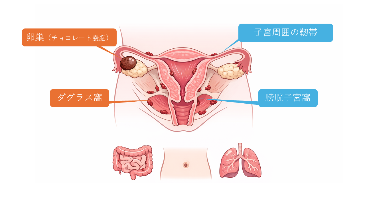 骨盤内のさまざまな部位に生じます。代表的なのは卵巣(卵巣子宮内膜症性嚢胞:いわゆるチョコレート嚢胞)、ダグラス窩、膀胱子宮窩、子宮周囲の靭帯、卵管などです。まれに腸管・臍・肺などにできることもあります。